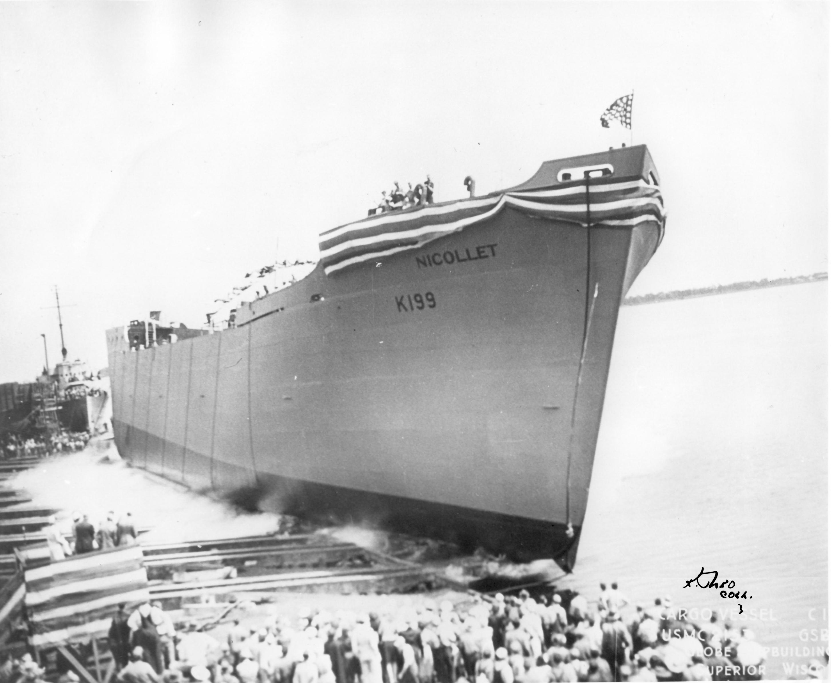 USS Nicollet AK-199 on July 31st 1944 launched by Globe Shipbuilding Co.,Superior,Wisconsin.